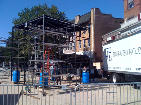 What are they building in there? HBO’s Cube takes shape.If you’ve been up at the intersection of 18th Street and Columbia Road NW today, you’ve no doubt noticed the freestanding scaffolding and truck parked there on the plaza. No, it’s not construction beginning on the controversial plaza sculpture (that’s been tabled for the moment), but rather a temporary art installation — or advertisement, depending upon your level of cynicism — from HBO and their “Imagine” project.