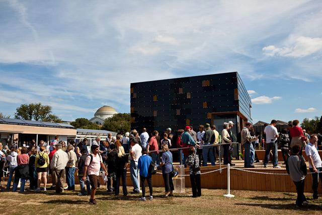 Photographer Justin Mathews took a look and shared his own experience. The winning design by Team Germany (mostly architecture students from Technische Universität Darmstadt) — a two-story cube covered in photovoltaic panels — is pictured. Read more about the Solar Decathlon entries here.