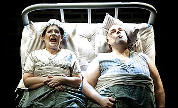 Benoit and Schmoll in “Adding Machine: A Musical”There’s a cliché out there that an opening number can make or break a show. Unfortunately, the first song in Adding Machine: A Musical, now being staged by Studio Theatre, contributes to the “break” side of the equation.