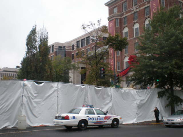 The Church of Scientology Religious Trust’s building at 16th and P Streets NW is the site of a barricaded celebration of some sort today — one which is blocking a sizable section of one of the District’s major arteries. (Obviously, I wasn’t invited behind the curtain. I mean, you should have seen my last audit: whew!) Police are out in full force around the humongous 50,000-square foot building, and security is tight — a ten-foot tall white temporary barricade is blocking off 16th Street; there are huge draping banners reading “SCIENTOLOGY” and “DIANETICS”, though, in case those walking by on their Saturday jaunts to the 14th and P retail corridor were wondering what the hell was going on with this big white thing in the middle of the street.