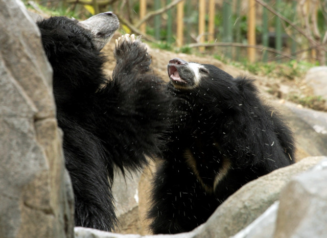 The National Zoo’s oldest sloth bear, Merlin (left), pictured here in 2008 with female sloth bear, Khali, passed away this morning. Photo Credit: Mehgan Murphy/Smithsonian’s National Zoo.