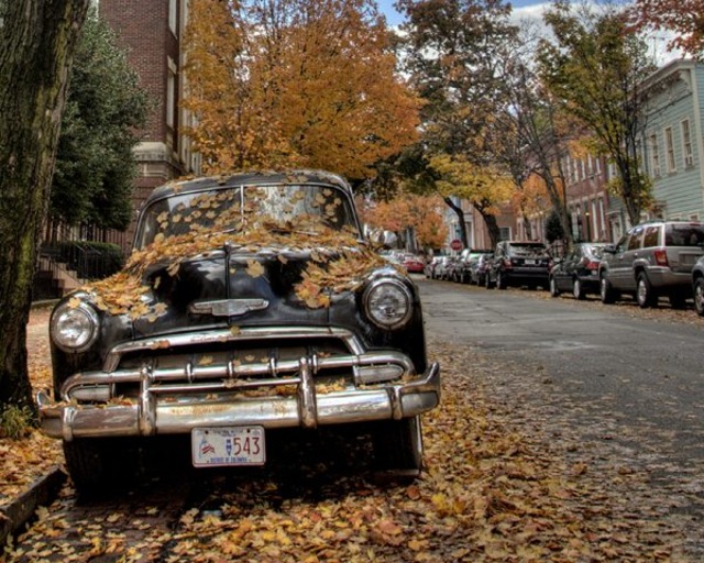 Cycle the Ghost Round‘s photo of what appears to be a 1949 Chevy Fleetline is a fall classic. A quiet Georgetown street, leaves blanketing the car, and a crisp autumn day with blue skies and fluffy clouds; just idyllic.