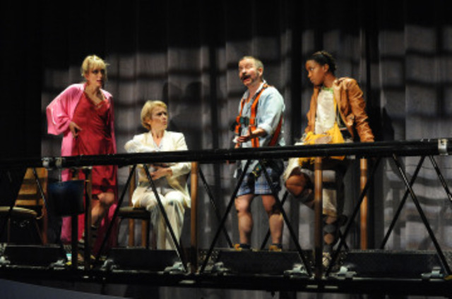 Full Circle is most focused on what’s going to happen to the baby of ousted political leader Erich Honecker (a wheezing, sputtering, committed performance from Sarah Marshall) and his mistress (Kate Eastwood Norris, dizzy but enraged) when it ends up in the hands of a self-absorbed socialite and a young would-be revolutionary. The journey puts the pair at the center of the action, and the two performers are fine company – Naomi Jacobson is poised, regal and airy as high-society Pamela, while Jessica Frances Dukes is heartbreaking with a side of crazy as her instant “au pair,” Dulle Griet.