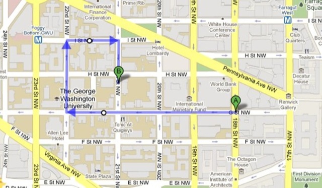 Public Enemy has turned public friend #1 for their performance in the District. Tomorrow night, Long Island Music Hall of Fame inductees, rap-rock progenitors, and occasional television mugs Chuck D and Flavor Flav are playing GW’s Lisner Auditorium – where you can advance to the front of the house for the price of admission plus a winter coat. If that deal’s not enough, you can also catch PE playing on a flatbed truck as, starting at about 7:45 p.m., it winds its way from 18th & G Streets NW to the Lisner a few blocks away. The Post’s Chris Richards notes PE’s route, rendered above in glorious Googlemap.