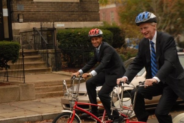 We’ve been following the work on the new 15th Street NW contraflow bike lane for a while now, and today the District Department of Transportation and Mayor Fenty hosted a little ceremony to announce its formal completion. But we have to thank IMGoph for tweeting to point out that one of the images DDOT sent around from the ribbon cutting features Ward 2 Council member Jack Evans (D) aboard one of the city’s SmartBikes. We’re used to seeing the likes of Fenty and famed cycling enthusiast Tommy Wells (D-Ward 6) on bikes, but Jack Evans? He looks about as comfortable as a bear on ice skates. Click through to DDOT’s Facebook page to scroll through the rest of their images from today’s event. DDOT Director Gabe Klein also joined Fenty and Evans for their little ride.