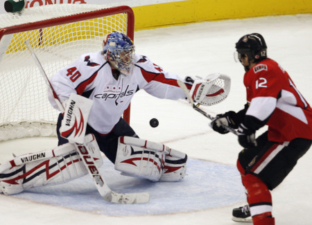 When DCist asked the Caps about their bad habit of taking far too many penalties in the third period of games last Friday night, no one seemed to know what was happening. They obviously haven’t figured it out in the last couple of days: Washington again committed three penalties in the third and the Sens equalized matters with Alex Ovechkin in the sin bin for roughing. The three power plays played no small part in Ottawa’s relentless pelting — 18 shots on goal — of Semyon Varlamov in the final twenty minutes.