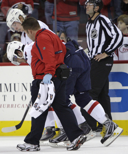 Alex Ovechkin (center) was unable to skate on his own after a bad knee-to-knee collision last night. (AP Photo/Gerry Broome)