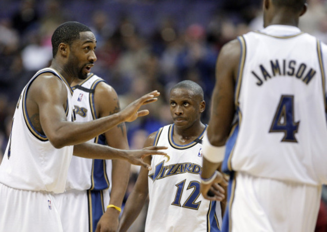 Tiny Earl Boykins [center] sure came up big in the Wizards’ 104-102 win last night. (AP Photo/Alex Brandon)Wizards 104, Bucks 102: In a league populated with giants, it’s easy to forget about Earl Boykins. Standing at five-foot-five and tipping the scales at 133 pounds, he is, so to speak, a David amongst the Goliaths of the National Basketball Association. (To wit.) But when Boykins picks up his figurative slingshot, he suddenly becomes a lot harder to miss. The Lilliputian one scored 11 points in the last ten minutes, including hitting two free throws with one second left to lead the Wizards to yet another win last night — their fourth in their last five games. That’s not to say Boykins didn’t have help though: the Wizards starting five were a combined +33, Gilbert Arenas had another solid game with 22 points and nine assists, and Brendan Haywood, Caron Butler, and Antawn Jamison combined for an average of nearly 11 points and 10 rebounds each.