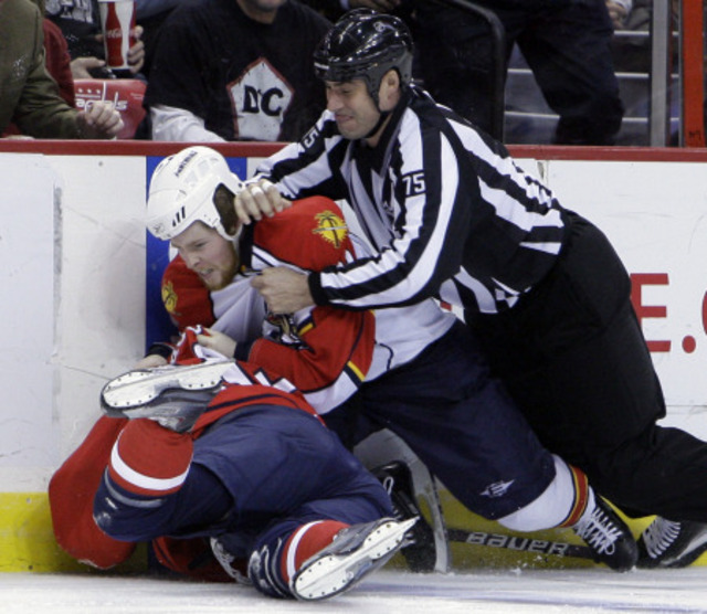 Florida replaced starting goalie Scott Clemmensen after Thomas Fleischmann scored again in the first, putting rookie goalie Alexander Salak into what looked like the Hockey Horror Picture Show. In a textbook case of how not to make an impression in your second NHL game, the Panthers’ Mike Duco creamed the Caps’ Alexandre Giroux near center ice and started throwing punches after Giroux checked two Panthers. By that time, the Caps were already up 4-0; Duco’s rampage gave them a seven-minute power play (he got called for instigating, fighting, aggressor, and a 10-minute game misconduct) during which the Caps scored twice.