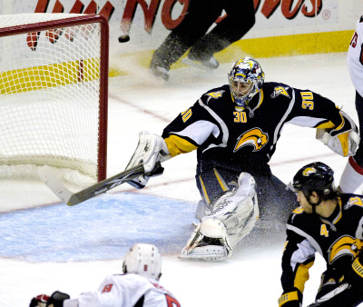 Sabres netminder Ryan Miller was so good last night, he even had the Capsmissing open nets. (AP Photo/Don Heupel)