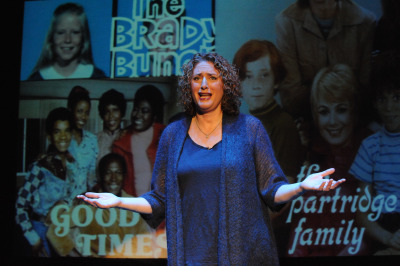 Gold’s life from childhood to present is meant to be smoothly stitched together by TV show asides, with high school, college and even parenthood explained in terms of the sitcom living situations Judy expected to encounter. We follow Judy through her head-banging infancy to her devastating high school years, and on to the formation of the 20-year relationship that begat two sons, all while being guided by Welcome Back Kotter‘s theme song and promo stills for Family Ties. Judy’s material focuses primarily on her mother and the pains of rejection by peers and managers because of her height. Only occasionally does she acknowledge common thoughts about lesbian births (“you get to take turns”) or roles within gay relationships (“who’s the man?” Judy’s response: “There is no man. That’s the point.”)