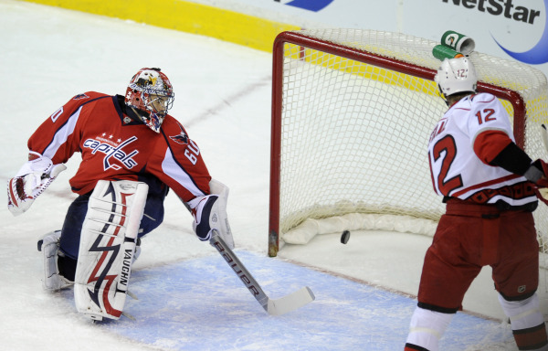 It was just that easy for Eric Staal and the Hurricanes at times last night, as Washington looked sluggish through most of a 6-3 home loss. (AP Photo/Nick Wass)Hurricanes 6, Capitals 3: Bruce Boudreau talked an awful lot about deflation in his post-game presser last night. He was on point, of course — pretty much everything about yesterday was deflating for the Capitals. First, the team’s captain of four years, Chris Clark, was surprisingly jettisoned to Columbus in exchange for winger Jason Chimera. Then, the team got off to it’s worst start of the season, managing only four shots in the first period, and falling into a 3-0 hole against a rival. Jose Theodore turned in another awful performance between the pipes. The team was on the butt end of some downright terrible officiating (oh, and a note to the league office: this diving business is really starting to get out of control — if it’s a penalty on the defender, how can the offensive player be diving?) which stunted any chance they had at a comeback. Eric Stall led Carolina with five points, handing Washington its first divisional defeat of the season — and leading Carolina to only their second road win this year. So yeah, it sure was a downer of a day in Capsland. But the sun will come up tomorrow. Bet your bottom dollar.