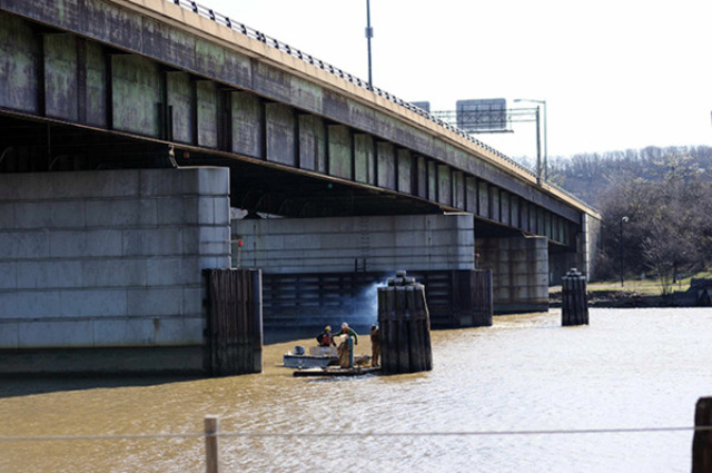 Initially the District planned to take reporters out on a boat to show them the entire construction site, but wind conditions prevented that from happening. But we didn’t want to let DCist contributor Jeff Martin’s photos from the day go to waste, so below, find a brief glimpse of the site of this huge, three-year construction project, which will see the new bridges erected in-between the existing ones in an effort to double the current vehicle capacity while at the same time installing a 14-ft. wide bicycle and pedestrian path.