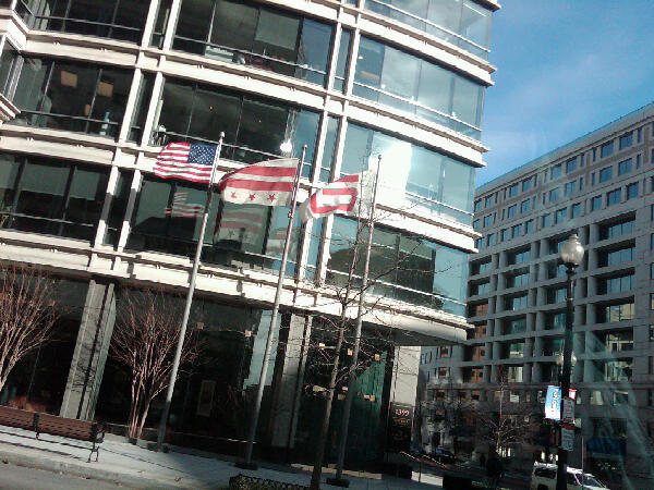 Whoops. A Twitter user spotted this today: the D.C. flag flying outside 1399 New York Avenue NW, the Executive Tower building, is upside down. Now maybe someone in the building is somehow in peril, since an upside down flag is a sign of distress, but calling 911 seems like it would be a faster option. Or maybe a building tenant, like Bloomberg’s D.C. bureau, is making a joke about the state of journalism.