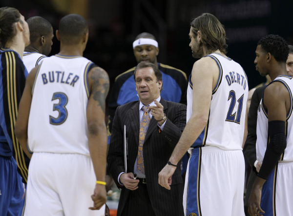 Wizards coach Flip Saunders certainly has a long road to haul. (AP Photo/Mark Duncan)Cavaliers 121, Wizards 98: So, any lingering reservations that life after Gilbert shouldn’t involve blowing up the team and starting fresh? Wednesday night’s loss to the hated Cavaliers did little to reinforce positivity about the remainder of the season. It was understandable that the offense would struggle after losing Arenas’ 22.6 points and 7.2 assists per game. But on the tail end of back-to-back road games, the defense was completely scattershot: 121 points was a season high for Cleveland, Shaq had 17 points in 17 minutes, the Cavs shot 57.3% from the field, and the notorious crab dribbler was but two rebounds and three assists shy of a triple double — even though he only played three quarters. Perhaps one of the few interesting things aside from how soon the Wizards front office implodes the team by trading Caron Butler, Antawn Jamison, or both, is who will step into Arenas’ spot in the starting lineup. Earl Boykins got the call last night, and Nick Young will be in the mix. But Randy Foye had 18 points against Cleveland and looks the safer bet — younger and more explosive — to take over full time at the point. Coach Flip Saunders certainly has some work to do to keep this house of cards together.