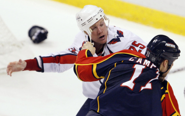 The Caps followed the lead of winger Jason Chimera’s Gordie Howe hat trick, and fought back to win in a shootout last night. (AP Photo/Wilfredo Lee)