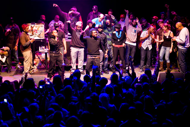 Wale headlined a bill stacked with local hip-hop artists at the 9:30 Club on Monday night, as D.C.’s music community staged a benefit concert in support of earthquake relief efforts in Haiti. Tabi Bonney, Paula Campbell, D.C. Don Juan, Phil Adé, and a host of other acts also performed at the event, for which the 9:30 Club donated the use of its facilities — club employees even donated their wages for the evening. All proceeds from the concert, including ticket sales, service charges, and drink sales, were to be donated to Partners in Health (a non-profit organization with a longstanding engagement with Haiti) and Yéle Haiti (the foundation started by Wyclef Jean that has recently come under scrutiny for alleged financial misconduct). The show appeared to sell out, and a festive atmosphere prevailed, culminating in the exuberance provoked by Wale’s characteristically boisterous performance. A number of speakers, including Ward 5 D.C. Council member Harry “Tommy” Thomas, Jr., addressed the crowd between sets, and the musicians offered frequent reminders of the crisis that prompted their congregation on Monday night.