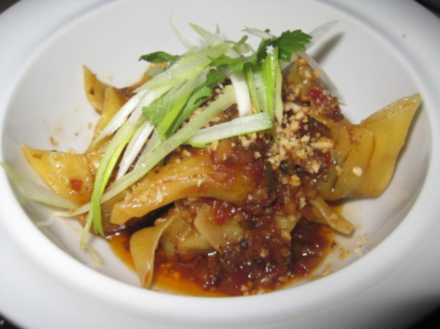 The dumplings, filled with chicken and topped with crushed peanut, combine these ingredients perhaps more familiar to a Western audience with the fiery traditional sauce born of pork, sichuan peppercorns, red chili peppers and pickled vegetables. The heat of the peppers is tempered by the juicy chicken and dumpling skin, while the pork base of the sauce and crushed peanuts add two more layers of flavor and texture to the dish.