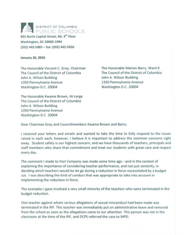 In a letter released this morning by DCPS, Chancellor Michelle Rhee responded to demands from D.C. Council Chairman Vincent Gray and Council members Kwame Brown and Marion Barry that she clarify her much-contested comments to Fast Company magazine, where she was quoted as saying, “I got rid of teachers who had hit children, who had had sex with children, who had missed 78 days of school.” Local reactions have zeroed-in on the sexual abuse allegation, wondering, as City Paper’s Mike Debonis put it, “How could a D.C. Public Schools teacher have sex with a student and remain on the job, sticking around long enough to be fired for budgetary reasons?”