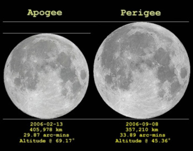 Like most orbits, the Moon travels in an elliptical, not a circular path around the Earth; tonight the Moon reaches “perigee,” its closest approach to us. As SpaceWeather.com notes, a Perigee Moon can appear “some 14% wider and 30% brighter than lesser full Moons of the year.” They also advise that,
