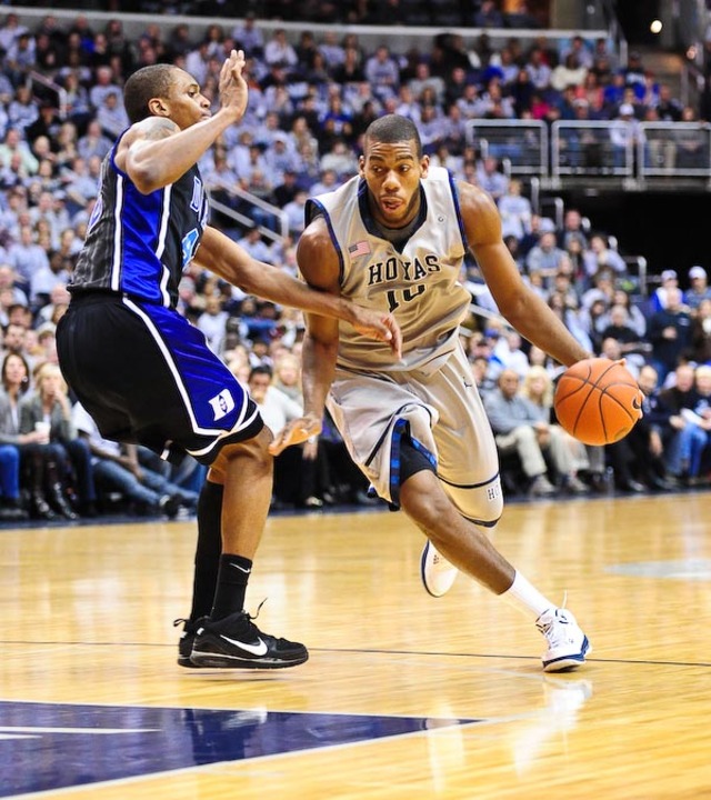 Still, on paper, this had the makings of a good one: two top-ten squads in need of a real marquee win, Georgetown coach John Thompson III going for his 200th win, the last game of an exciting four-year series between the two programs, and rumors flying that Obama would be in attendance. [Which, obviously, he was. A complete gallery of Obama’s afternoon at Verizon Center in a bit. – Ed.] The gathering snowfall outside didn’t deter too many fans either — the place was packed for a “Gray Out” (we’re not done with this concept yet?) and the Hoya student section was in good voice early.