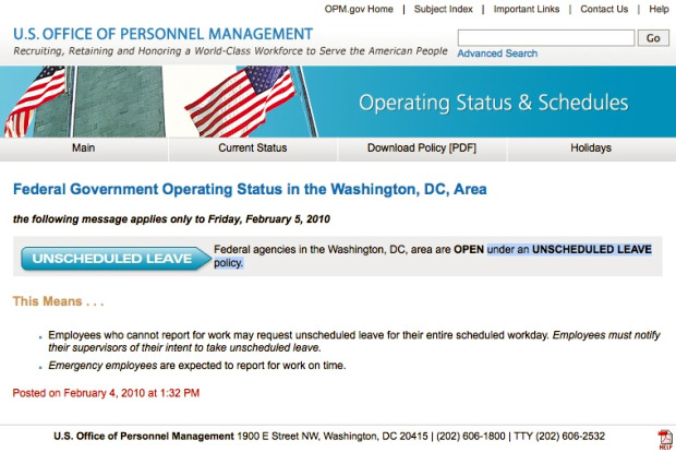 Despite increasingly ominous snowfall predictions, the latest from the U.S. Office of Personnel Management is that the feds will stay open tomorrow, albeit with an unscheduled leave policy in effect.