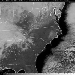 “[It’s] unlikely to be a crippling storm” — broadly stated but still very comforting words to read from the Capital Weather Gang, who says that while we will likely get a couple more inches of snow tomorrow, it may be balanced with some rain and will be considerably less of an issue than the recent snowfalls we’re still digging out of. The Alberta clipper (seen at right via satellite) that will move in from west of D.C. should finish its business late tomorrow. Frankly, we’re a little more dismayed about the cold, blustery burst that’s scheduled to hit on Tuesday and Wednesday, which will certainly make efforts to clear those big piles of snow from roads and sidewalks an even more miserable experience.