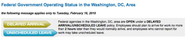 The U.S. Office of Personnel Management has declared that Tuesday is another two-hour delay/unscheduled leave day. We were actually a bit surprised by the decision, but at least it’ll help stagger out the morning commute.