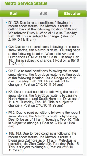 DCist heard from frustrated D2 Metrobus riders over the weekend, via both Twitter and email, who complained they hadn’t been made aware that the route was still not really running normally since last week’s double-blizzard. The last WMATA had announced, the D1 was one of the remaining bus routes still not up and running, but they didn’t say anything about the D2. So what gives?