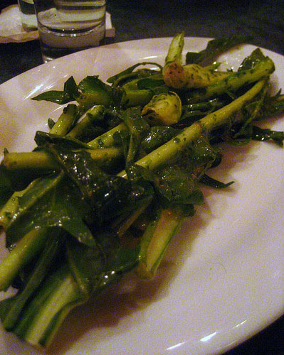 The traditional Roman method of consuming puntarelle is in a salad with a light dressing of anchovy, garlic, parsley and lemon. The light dressing highlights the bitterness of the vegetable, while adding saltiness and an extra kick of pungency. For a limited period of time, Dino has imported puntarelle from Treviso, Italy. It has a stronger, more bitter kick than the puntarelle that is usually brought in from Pennsylvania. The Italian stuff is around for a limited time, so check ahead to make sure they have it. If not, the more local puntarelle is still delicious.