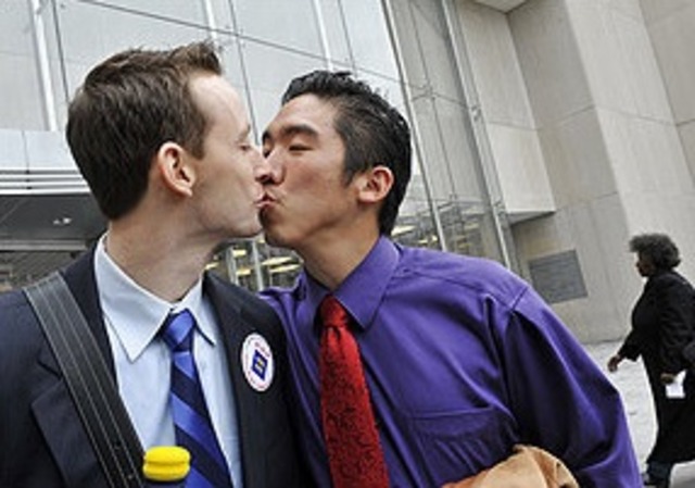 Do read this killer blog post from Washington Post ombudsman Andy Alexander today on complaints from readers about last week’s front-page photo of Jeremy Ames and Taka Ariga kissing. The two men had just emerged from D.C. Superior Court after filing for a marriage license on Wednesday, and a Post photographer captured their happy moment. But at least 27 people were considerably less happy: that’s how many individuals Alexander says canceled their subscriptions because they found the image so offensive.