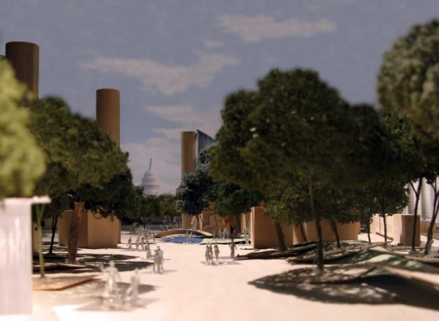 The selected design concept includes a series of 80-foot-tall columns and large woven stainless steel tapestries that depict images and themes of Eisenhower’s life, all around a central grove of oak trees.