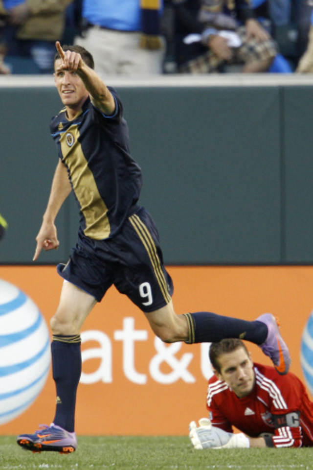 Philadelphia striker Sebastien Le Toux, left, hit a hat trick in histeam’s first ever MLS win — and sent United crashing to 0-3.