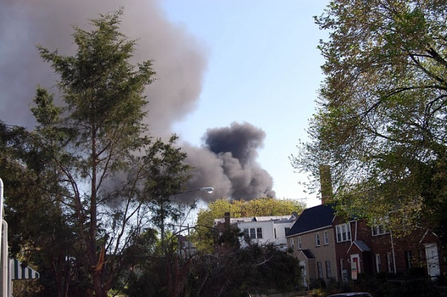 By all accounts, the fire that broke out on the roof of Eastern Senior High School on Sunday caused remarkably little real damage. The only thing that really burned was a section of rubberized roofing material, leaving the concrete roof below mostly unharmed. But take a look at the above photos, sent in by DCist reader Logan Worsley, and you get a better sense why plenty of neighbors of the school were convinced the whole building was going to burn down. That petroleum-based roofing material sure created a lot of dark, billowing smoke.