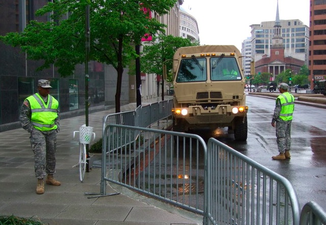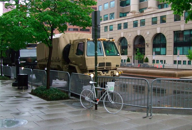 The bicycle is currently locked to a street sign right beside some temporary fencing in place for the Nuclear Security Summit, which is winding down today. The above image also eerily shows a military transport truck similar to the one involved in Holden’s death parked right beside the tribute. From WABA’s press release: