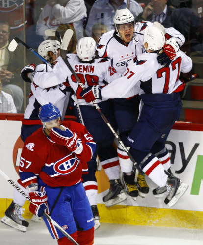 Capitals 6, Canadiens 3: So much for the vaunted home ice advantage that Montreal earned with a split at Verizon Center in Games 1 and 2. Bell Centre, the largest arena in the NHL with a capacity of 21,273, was silenced — perhaps for the season — as the Caps put six on the board and the first nail in the Canadiens’ coffin, taking a 3-1 series lead. Washington battled back from a 2-1 deficit with goals from Mike Knuble (shorthanded), Jason Chimera and Alex Ovechkin (his second of the game), before Knuble and Nicklas Backstrom added empty netters to put the game away. Ovechkin also broke an 0-15 power play drought with the Caps’ first goal of the game. Semyon Varlamov was very solid in net despite allowing three goals. Varlamov made 36 saves, and was especially good in the second period as Montreal threw 21 shots on goal. In the opposite net, Carey Price got the start in place of the shaky Jaroslav Halak and drew not one, but two unsportsmanlike conduct penalties for firing pucks towards the Caps bench after Chimera’s and Backstrom’s goals. A Russian machine may never break; but the Montreal Canadiens’ collective psyche is certainly broken beyond repair.