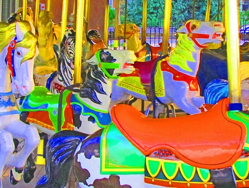 With cameras, sicko. They shoot horses with cameras. Specifically, christaki nabbed shot these horsies at the carousel on the Mall. It’s sort of a sick photo. The gross-out greens and overripe oranges really pop, and it’s hard to say whether this Gauguin-esque picture’s been touched up. (I suspect not so much. See those trees through there?) It puts me in the mood to watch the Derby (but not so much to drink).