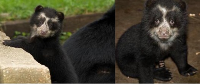 Possible names for the two cubs — one female and one male — are listed below. Zoo officials note that the male, pictured above on the right left, has more pronounced “eyebrows” or spectacles (Andean bears are also sometimes called spectacled bears) than his sister, and that’s how they tell them apart.