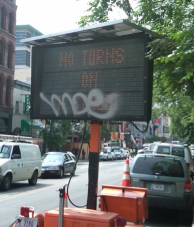 Image courtesy the DCist tip lineNew posted signs indicate that no turns of any kind are allowed at the intersection. Variable message boards have also been placed at farther back approaches, though a graffiti tag on one of them makes it difficult to read (see right).