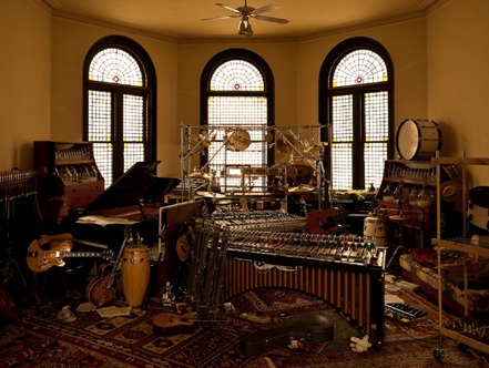 Pat Metheny (bottom left) and his OrchestrionDuring last night’s show at the Music Center at Strathmore, images of those Animusic digital shorts that used to appear from time to time on PBS came to mind. To the unfamiliar, the segments combined rather bland synth-based orchestrations with computer generated images of mechanical devices playing the corresponding instruments. Last night, this concept came to life.