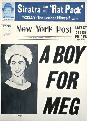 A Boy for Meg is an intriguing early work from Warhol, and catches him not deploying his now-distinctive visual language of modern advertising, with garish colors, simplified forms and repetition. Here he starts out with a front page of the New York Post: he’s literally lifted the appearance of the ready-made text and images off his source page and replicated them wholesale onto the surface of his canvas. The effect is odd and unexpected: the mass-produced nature of the subject and the unremarkable treatment of the visual elements (flat strokes in black, blue and white oil, hardly any detail anywhere), detract from the “painted-by-hand” sensibility.