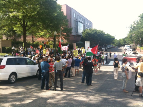 Protesters gather in front of the Israeli Embassy before heading to the White House (Eddie Kim)Protesters led by several organizations gathered in front of the Israeli Embassy near Van Ness this afternoon in response to the deaths of nine pro-Palestinian activists by Israeli naval commandos while seizing control of their ship. The vast majority of the protesters were comprised of members from ANSWER, Code Pink and The US Campaign to End the Israeli Occupation. Although the embassy appeared to remain closed, a minimal police presence stayed to watch over the picketers.