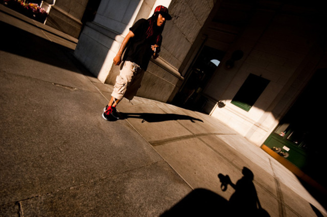 With the sun low in the sky and casting long shadows, erin m shoots a two for one portrait at Union Station. The bag wielding, camera clicking shadow captures the smoker whose hat matches his dreadlocks which match his shoestrings. (EXIF)