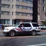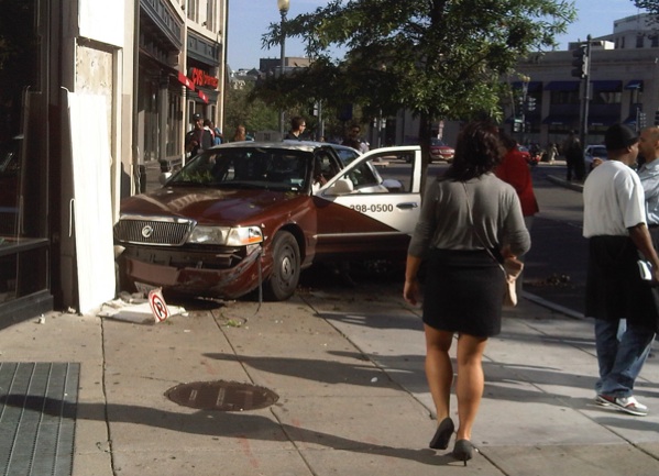 Reader Ryan Samuel K. sends in this image of a taxi that hopped the sidewalk by the CVS on Dupont Circle this morning and smashed into the facade of the building. Ryan says he happened by the scene at about 8:25 a.m. No reports of any injuries, and DCist’s Aaron Morrissey reports that a tow truck has since arrived to haul away the wreck. The damage appears to be fairly minimal, though a “no parking” sign was completely demolished.