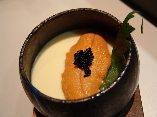 Chawanmushi topped with sea urchin, caviar, and shiso leaf. Photo by takaokun.Dish of the Week: Chawanmushi