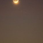 >> It’s Planet Tic-Tac-Toe in the sky right after dusk. The ringed-planet Saturn hangs near the Moon in the western sky; diagonally down and to the right in the center square is Mars, and further down the line is Venus, setting around 10:30 p.m. tonight.