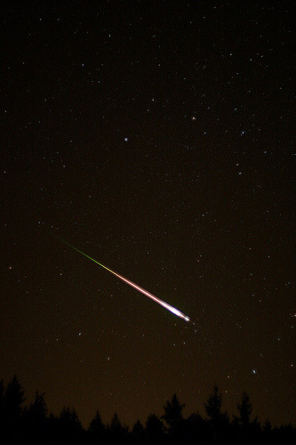 Last Thursday, it seems a fireball lit up the sky over Washington. I’m sorry to say we missed it at DCist HQ and only heard about it later via the Washington Post, which reported that sky-gazers in D.C. — and as far away as New York and West Virginia — saw an incredibly bright greenish-yellowish streak across the sky at about 9:55 p.m. The American Meteor Society records these “fireball” sightings, this time logging over 50 entries at an average apparent magnitude of -13, which is equivalent to the brightness of a full Moon. (If you recall, the very bright ISS passes I mentioned on Friday were only around -3.)