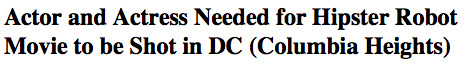 DROIDSTER is a action/drama short set in Columbia Heights, DC. Robot hipsters are operating out of basements in the neighborhood, abducting unsuspecting preppies and turning their insides into oily mechanics. These aren’t your father’s evil robots, however — they ride fixed gear bikes, wear skinny jeans, jeggings, christmas socks, and big sunglasses. They also suck at life.