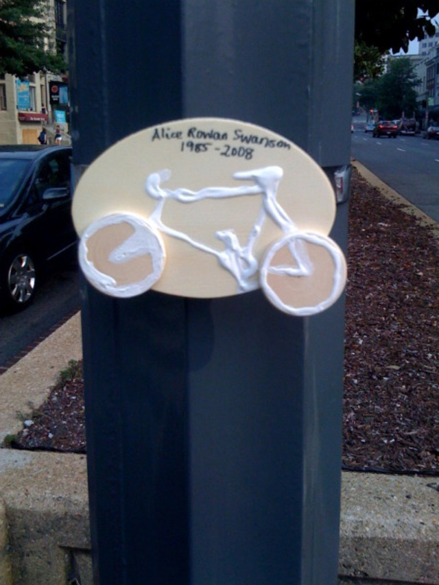 The scene leads us to revisit the drama that bubbled over regarding the erection and removal of ghost bikes in the wake of Swanson’s death. If you’ll recall, the Swanson memorial ghost bike was put up the day after her death; but in late August 2009, the memorial had been removed, quite hastily, by the D.C. Department of Public Works. In response to the removal, activist Legba Carrefour placed 22 ghost bikes around the intersection; DPW later attempted to clarify that sidewalk memorials can stand for 30 days before the agency posts notice and then cleans them up, even though Swanson’s original memorial stood untouched for over a year. After devolving into “a mess,” Carrefour’s bikes were eventually removed in late September.