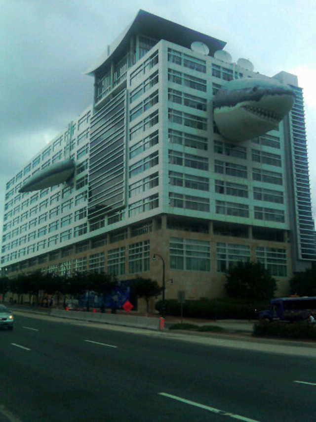 Bum-bum-bum-bum! Reader and regular commenter DistrictDon19 snapped this shot of the Discovery Channel’s headquarters in Silver Spring, which has been quite appropriately outfitted for the cable channel’s annual Shark Week. You’ll never go in the water again!